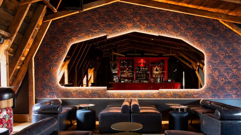 Enveloped in wooden mansards, the old attic is an eclectic mix of new and old, with a Japanese shrine-inspired red bar offset by a black and white Tokyo and Kyoto photo wall. The bar opens up to an airy outside rooftop terrace.